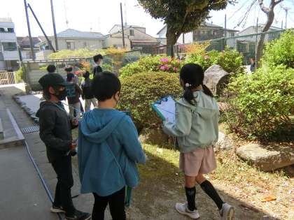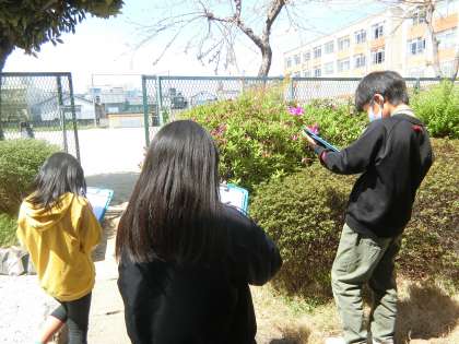 理科の学習で,植物の観察をしました。運動場のイチョウの木や,朱雀の庭に生えている梅の木など,自分たちの気になる植物を選びました。形や色,大きさに注目して丁寧に観察することができました。「先生!モンシロチョウが飛んでるよ!」と,植物だけでなく,生き物を見つけている子もいました。今日選んだ植物を1年間を通して観察していきます。夏・秋・冬にはどのように変わっていくのか気になっているようです。