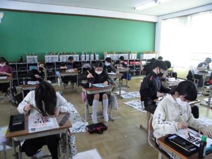 「私の一文字」今日は清書です。自分が選んだ文字に思いがこもっています。