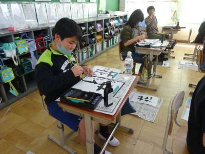 書写の学習で,「花」という字を書きました。3年生で学習したことを生かして取り組むことができました。4年生になって初めての書写の学習でしたが,静かに集中していました。また,一人ひとりが丁寧に書いた作品について,友だち同士で良いところを褒め合っている姿もあり,とてもほっこりする場面がありました。