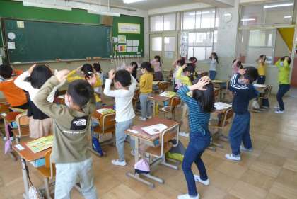 1年生は音楽の学習で「ともだちと いっしょに おどりましょう」をテーマに,セブンステップスやチェッコリを踊っています。