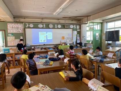 図書の時間には,学校司書の先生によるオリエンテーションがありました。学校図書館は置かれている本の種類によって,読書センターと情報活用センターという二つの部屋に分かれていることや,本の分類について教えていただきました。クイズなども交えながらとても楽しい時間を過ごしました。