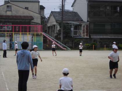 交流学年の4年生の体育では,20mシャトルランをおこないました。今年度は新型コロナウイルス感染症対策として,屋外で実施することになりました。昨年度までは,先生と一緒に走っていましたが,今回は交流学級の先生などからサポートしてもらいながら一人で走りました。また,友だちの記録やチェックなどの役割も担うことができました。