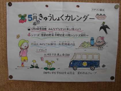 5月の給食目標は、「みんなでなかよく食べよう」です。シリーズは,季節の野菜・京都の食べ物,25日(火)は,和(なごみ)献立〜和食推進の日〜です。今月の地産地消献立は,5月20日(木)です。