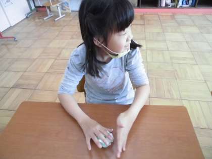 粘土遊びは,創造力を育てる,手先が器用になる,脳に刺激を与える,思考力を高めるなどの子どもの成長によい影響を与えると言われています。柔らかな粘土の触感を楽しみながら手指の力加減を養うために3組でも図画工作や自立活動の学習に紙粘土の活動を取り入れています。2色の紙粘土を混ぜて新しい色を作る,マーブルの模様を楽しむなどの活動や丸めたりする活動に取り組んでいます。