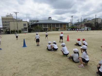 今日の体育のリレーあそびでは,距離をのばしたり,障害物を走り越えたりしながら取り組みました。「がんばれ!!」の応援で一生懸命走っていました。
