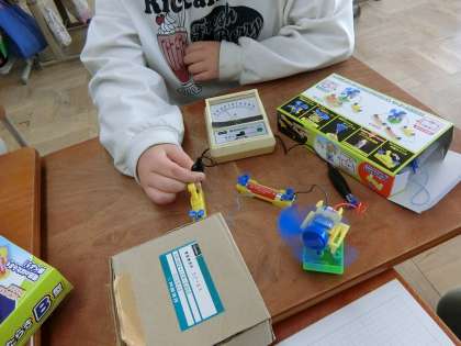 理科の学習で「電池のはたらき」に取り組んでいます。今回の学習問題は,「電池の向きを変えると,電流の向きは変わるのだろうか。」です。電流は目には見えませんが,モーターの回る仕組みを考え,電流との関係に気づきました!これからは,目に見えないものを理科の学習でとらえていくことも増えてきます。難しくなっていきますが,理科の学習を楽しみましょう!