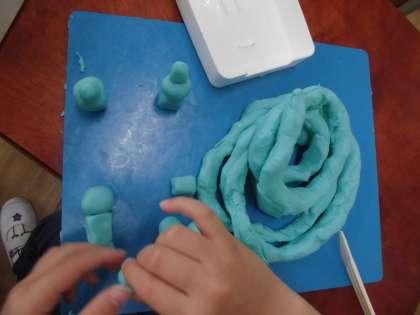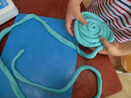 図画工作で粘土をひもにしながらいろいろな形に変身させました。どんどん長くして「へび」になったり,くるくる巻いて「かたつむり」になったり,かたちを変えて楽しみました。