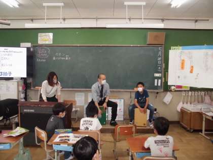 2年生の教室から楽しい雰囲気が伝わってきたので教室に入ると,教頭先生がカホンの楽器を紹介していました。