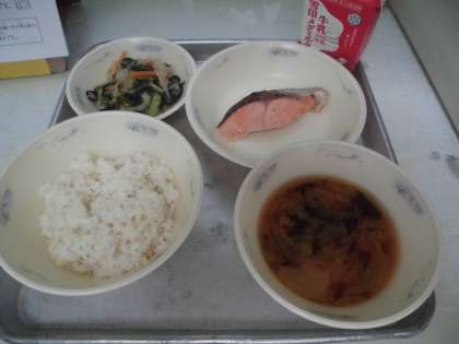 5月20日(木)の献立は,「麦ごはん,牛乳,さけの塩こうじ焼き,小松菜と切干大根の煮びたし,みそ汁」でした。「さけの塩こうじ焼き」は,さけを塩こうじに漬け込み,スチームコンベクションオーブンで焼きました。塩こうじは,日本に昔から伝わる調味料です。塩こうじに漬け込むことで,さけの身が柔らかくなりおいしくなります。