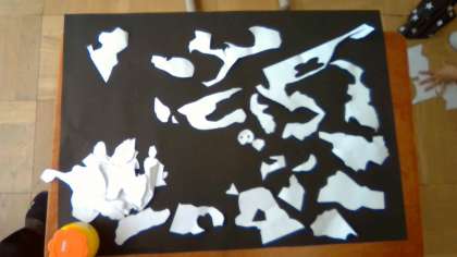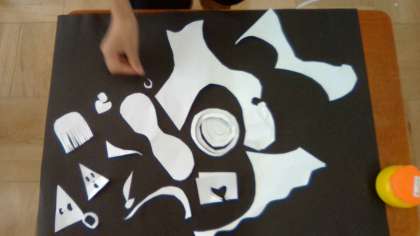 切った形を黒色の画用紙に並べたり,位置や向きを変えたりしながら,何に見えるかな?とイメージを膨らませて,作品を仕上げていきました。みんなとても楽しそうに活動していました。