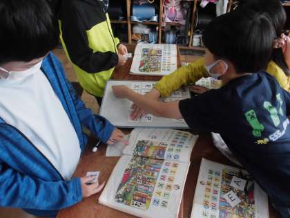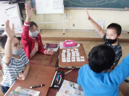 また,最後には,短い時間でアルファベット順にカードを並べられるか競うということで,グループで協力して並べ,「できました!!」と手を挙げて全力でアピールをしていました。