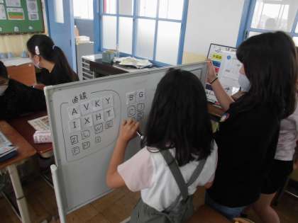外国語の学習では,アルファベットについてゲームを交えて学習しました。まずは,すでに知っているアルファベットをどんな仲間に分けることができるかグループで相談してみると,「直線だけでできているものと曲線が混じってるのがある!」「画数が1,2,3画まである!」など様々な視点で考えていました。