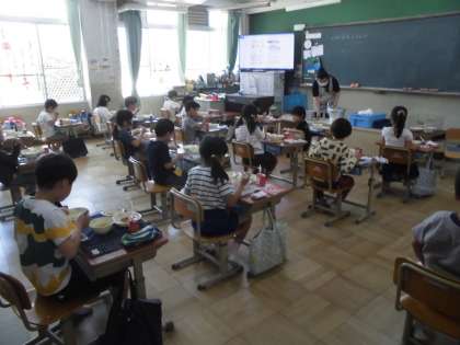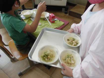 給食エプロンもうまくたためるようになり,配るのも早くなりました。給食中は黙食でいただいているため,美味しいときは目で表現しています。苦手な野菜も少しずつ食べられるようになってきました。大好きな給食が増えました。みんなが一番大好きな給食は「カレー」です。
