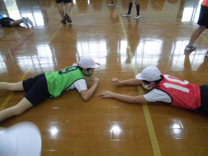 次は,「猛獣狩りに行こうよ」「進化系ゲーム」です。全員が恥ずかしがることなく,めいっぱい楽しんでいます。みんなの笑顔があふれる体育館は,幸せオーラでいっぱいです♡進化系ゲームでは,イモムシ→カエル→ハト→ヒトとじゃんけんで勝ったら進化していくゲームです。イモムシになりきったり,ハトになりきったり…ノリノリのみんなです。