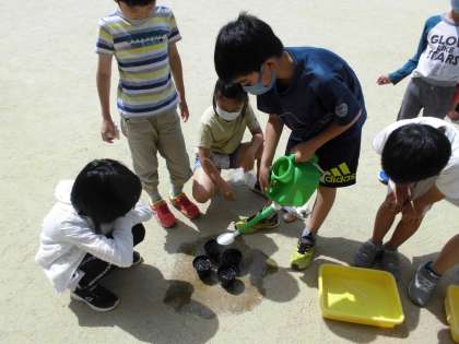 「ホウセンカはなぜ軽く土をかぶせるだけなのかな。」「ヒマワリは大きくなるから間隔を開けて種まきをするのだと思う。」など考えながらたねまきをしました。
