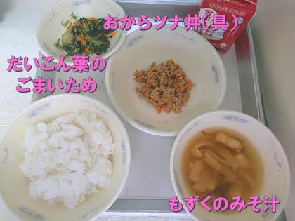 今日の献立は,「ごはん・牛乳・おからツナ丼(具)・だいこん葉のごまいため・もずくのみそ汁」でした。