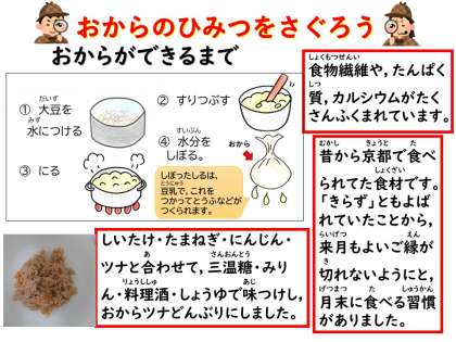 おからツナ丼(具)は,おからを乾燥させてパウダー状にしたおからパウダーと,ツナ,野菜を使った丼の具です。教室で子どもたちそれぞれがごはんにのせて,丼にして食べます。細かく切ったにんじん・しょうが・たまねぎをいため,三温糖・みりん・料理酒・しょうゆで味付けして,しいたけ・ツナ・おからパウダーを入れて,汁気がとぶように煎りつけて作りました。ごはんに全部のせたり,少しずつのせたりそれぞれ楽しみながらおいしそうに食べていました。