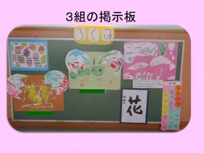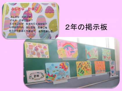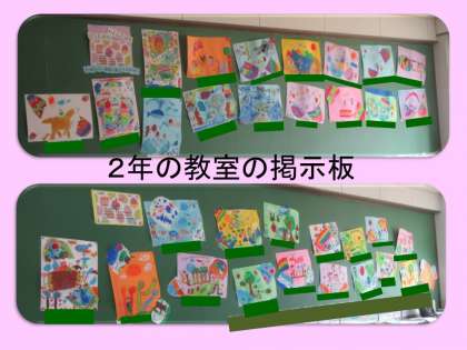 今日は,2年と3組の掲示板です。図画工作や書写で取り組んだ作品を掲示しています。