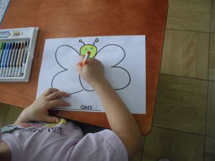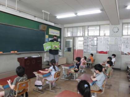 英語活動で色の学習をしました。『A Beautiful Butterfly』の読み聞かせの後,蝶の絵に好きな色をぬってオリジナルの蝶を描きました。そして,みんなの前でどんな色を使って蝶を描いたのか発表しました。