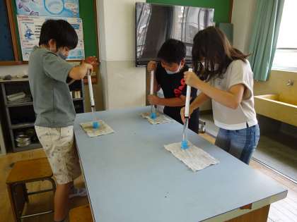 授業では,「とじこめた水に力を加えると,どうなるのだろうか。」という学習問題を立てて学習しました。水をとじこめて押してみると,とてもびくともせず,「かたい〜!」「全然押せへん…!」と,驚いたようでした。水の空気の違いに気づいたようです。生活の中でもつながることがないか探してみましょう。