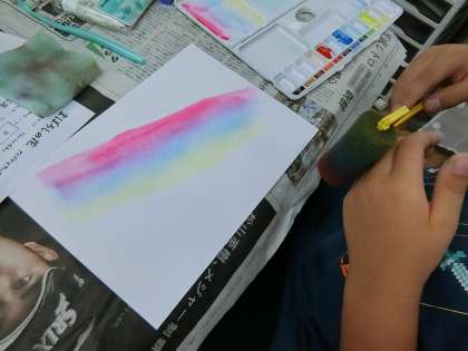 今回は,「まぼろしの花」を描くときに使う技法の練習をしました。ローラーやスポンジなど,色々な道具を使って絵の具で表現することをとても楽しんでいました。実際に描くときに,どのように技法を生かしてくれるか楽しみです!