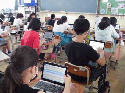 英語の学習はユニット2まで学習が進み今日は確認のテストをしました。タブレットを使っての初めてのテストです。子ども達は「テストもタブレットか・・・!」と驚きの様子を見せましたが,いざ問題に取り組むと,すいすいと回答していました。