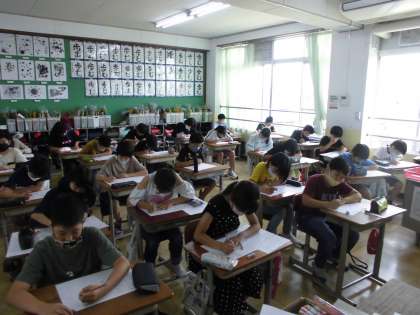 書写の時間に『枕草子』の一文を硬筆で書きました。文字の大きさや配列,文字の中心をそろえることを意識して書きました。鉛筆の持ち方や姿勢にも気を付けて練習しました。書写の時間なので,文字を書く基本をいつも以上に意識しましたが,普段の学習でのノートやプリントに書く文字にも活かすことができたら,と思います。今日は鉛筆書きで練習しましたが,次回はペンで書いていきます。