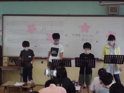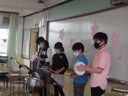 打楽器アンサンブルの発表会をしました。どのグループも,リズムや音を合わせたステキなアンサンブルでした。特色のある楽器を使ってのアンサンブル。とてもよかったです。