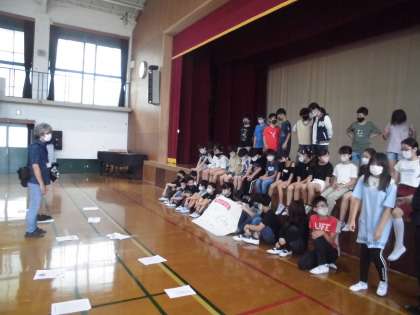 山の家宿泊学習にかわるレクリエーションの始まりです。体育館に集合し,健康観察,開会の言葉,旗あげ,校長先生の言葉と,本番さながらで行いました。活動のめあてとして次の3点を挙げ,一人一人が自分のめあてもしっかり持ってしおりに記入し,活動が始まりました。