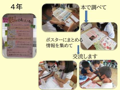 4年生は,「伝える極意」を見つけるために,たくさんの本から情報を見つけてくる学習を行いました。集めた情報を整理して,友達と伝え合うことで,よりよい情報を選んでポスターに仕上げることができました。集めた「伝える極意」を使って,これからの学習で人に何かを伝えるときに生かせるといいですね。