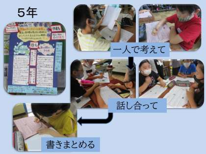 本校では,国語科の学習を中核にして,子どもたちが主体的に学ぶことができるように取り組んでいます。6月には,1年・4年・5年の学級で授業する様子を,教員で見合いました。