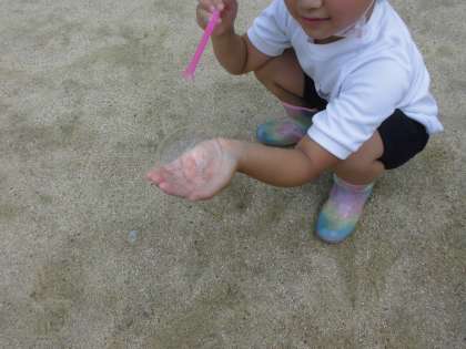 しゃぼんだまを楽しみました。始めはうまくできませんでしたが,徐々にうまくなり,大きなしゃぼんだまができました。