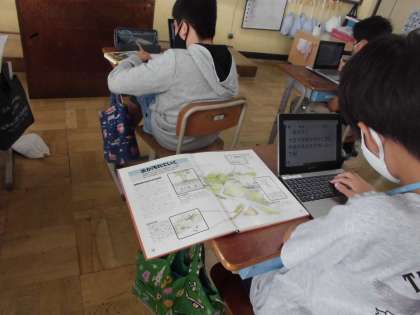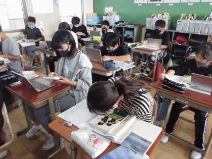 国語の学習ではブックトークに向けて準備をしています。この単元は読書を中心にした学習で,自分と本との関わりを振り返り,自分で決めたテーマに沿って読書をし,それらの本の魅力が伝わるようにブックトークをします。