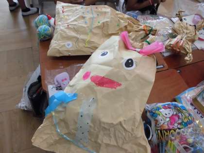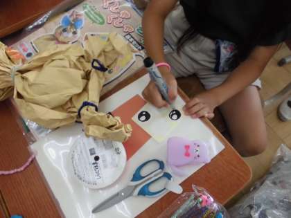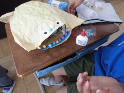 子どもたちは,くしゃくしゃぎゅっの学習をとっても楽しみにしており,製作にとっても気合いが入っていました。魚や動物などいろんな物に見立て,紙袋をくしゃくしゃにしたり,ぎゅっと縛ったり思い思いの形に変化させ,目や尻尾の飾りつけをし,自分だけの作品を完成させていました。