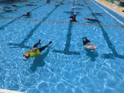 水中で泳ぐことが難しいことを体験した後は,水面に浮く練習をしました。