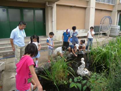 活動前にちょっとだけお楽しみ,みんなで池の魚にえさをやりました。