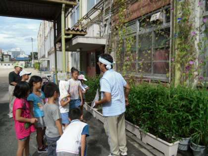 という意外な答えは,「うめぼし」と答えてほしかった校長先生を困らせていました。四角い茎をさわって形を確かめた子どもたち,その横に生えているコリウスの茎も四角いことから,しそとコリウスが仲間だということも教えてもらいました。