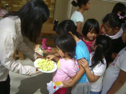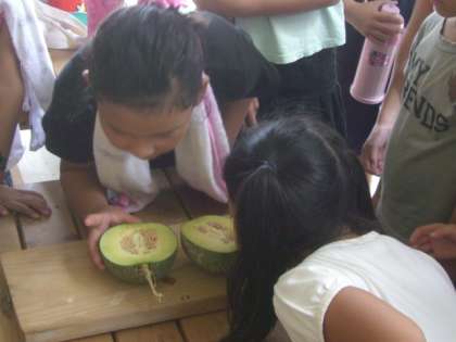 少し前に,ゴーヤのトンネルにできたメロンを紹介しました。そのメロンをみんなで食べるのです!中身はどんなふうになっているのでしょう・・・そっと包丁を入れました。