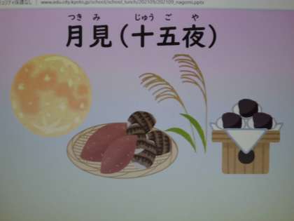 今月は「月見」について学びました。月見には,昔からすすきをかざり,田畑でとれた農作物ただんごを供えて,秋の実りに感謝し,祝ってきたことや,「ずいき」のこと「ずいき祭り」のことなども学びました。