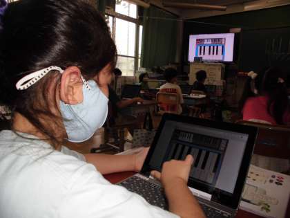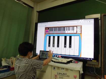 1年生は鍵盤ハーモニカの代わりにGIGA端末を活用して,指でド・レ・ミの位置の確認やタッチパネルの触り方を確かめ合っていました。