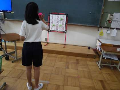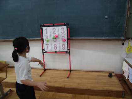 育成学級の自立活動体の学習では,ストラックアウトに取組んでいます。はじめは1mくらいの距離から投げていましたが,4年生は3m程度離れたところから投げてもパーフェクトを達成することができるようになってきました。