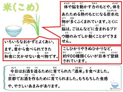 今日のごはんは,酒米でした。酒米は,お酒を造るために育てられたお米です。日本で育てられるお米はほとんどが炊いてそのまま食べるものか,もちになるもち米です。酒米は全体の数%しか作られていない珍しいお米です。もちもちした食感とやさしいあまみがあります。子どもたちは,「お酒?ぼくたち食べて大丈夫?」と心配していた子もいましたが,「お酒になる前だからもちろん大丈夫!」というと納得!「もちもちしていた」「いつもよりやわらかかった」「おいしかった」と味わって食べていました。7月にも食べましたが,その時は丼にしたため,今回のほうがより味わえたようでした。
