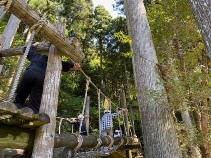 さぁ!アスレチックゾ−ンです。自然を背景に活動します。決して無理をすることはないようにと話しています。