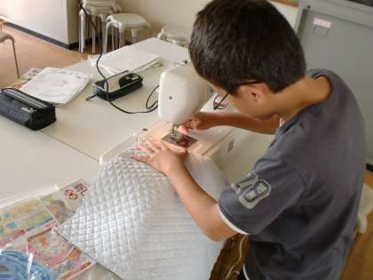 家庭科では,ミシンの使い方を学習した後,ナップザックを作っています。学習したことを作品作りに生かしたいのですが,ミシンで縫う前段階である印つけや仮縫いに悪戦苦闘!それでも,何とかがんばってミシンで縫う活動に入っています。これからも苦労すると思いますが,友達と励ましあいながら,いい作品を作ってほしいと思います。