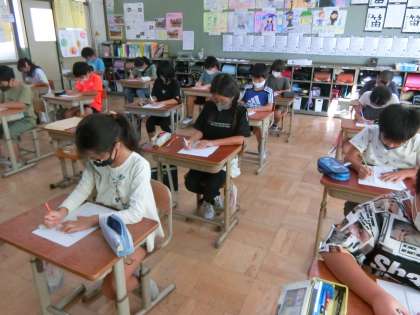 書写の学習で,「ごんぎつね」の一節を硬筆で書きました。背筋を伸ばして,姿勢よく丁寧に字を書きました。いつもこの姿勢で座るのは辛いですが,意識してみるといつもよりきれいに字が書けたようです。