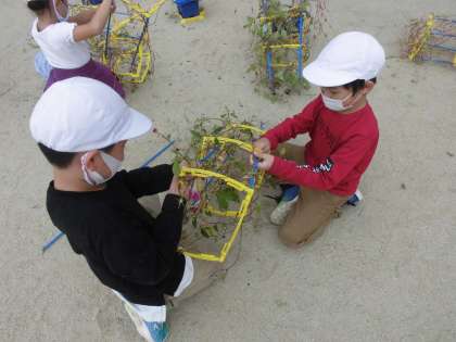 あさがおのつるでリースを作りました。支柱にしっかりとつるが巻いていたので,お友達にも手伝ってもらいながら作りました。しばらく乾燥させてから,周りを飾りたいと思います。どんなリースが出来るのか楽しみです。