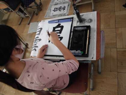 久しぶりの習字ということで、準備の時から少し興奮気味でした。準備が終わると、一旦心を落ち着けて、練習に入りました。今日の字は『白雲』です。漢字同士の大きさに気を付けて一画一画丁寧に集中して書きました。