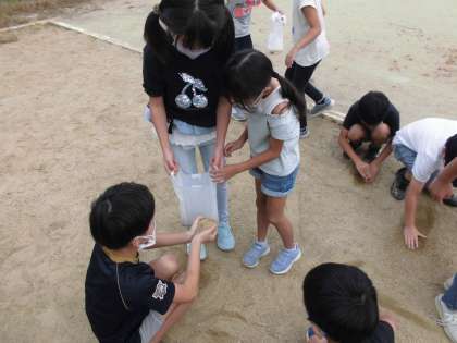 先週は,1kgの重さがどれくらいかを考えながら砂を袋に入れる学習をしました。また,量る前に重さを予想し,実際に量った重さと比べる学習もしました。イスのような上皿ばかりに乗せられないものは,ばねばかりを使い重さを量りました。