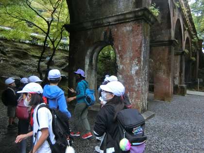 南禅寺水路閣を見学しました。景色のきれいさや水路閣の大きさにまず驚いていました。レンガを一つ一つ積んで作ったことを考え,工事の大変さが分かったようです。「紅葉がきれいな時期にも来てみたいな〜」と言っていました。見た目の美しさにこだわった理由もみんなで考えました。