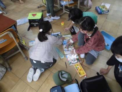図画工作で,教室や体育倉庫にあるいろいろな材料(三角コーン,ハードル,フープ,ランドセル,鍵盤ハーモニカ,クレパスなど)を使って,グループで話し合いながら家や迷路,町などをつくりました。